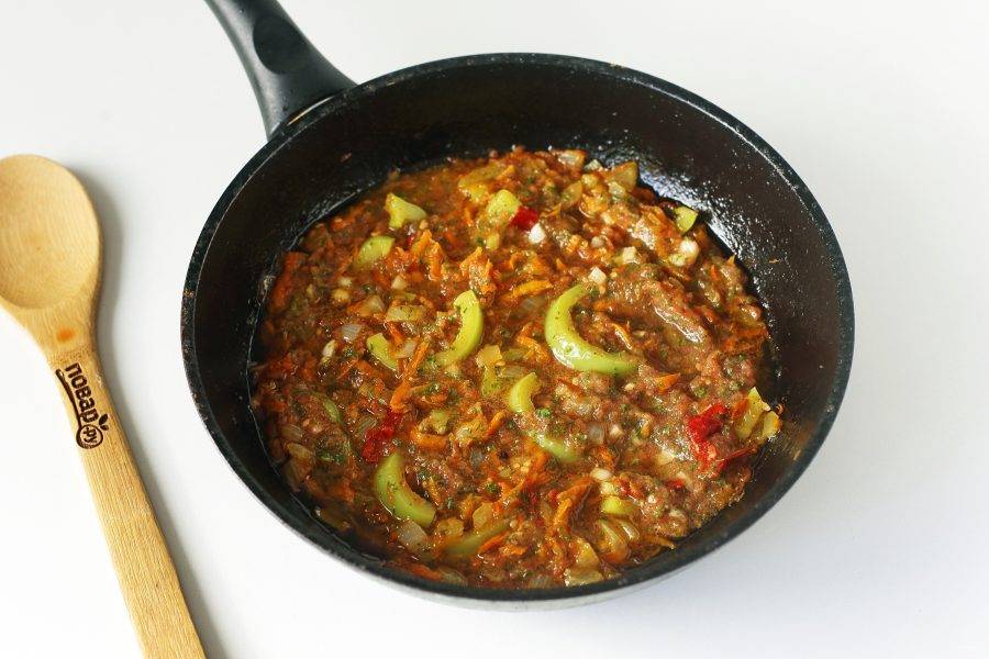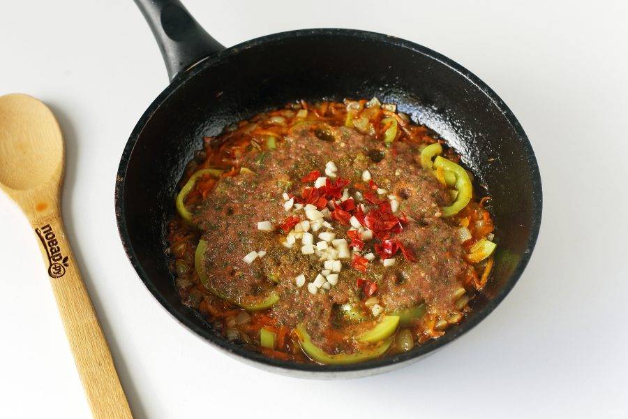 Готовьте все вместе около 5 минут, после чего добавьте томатный соус, измельченный чеснок и мелко нарезанный острый перец.