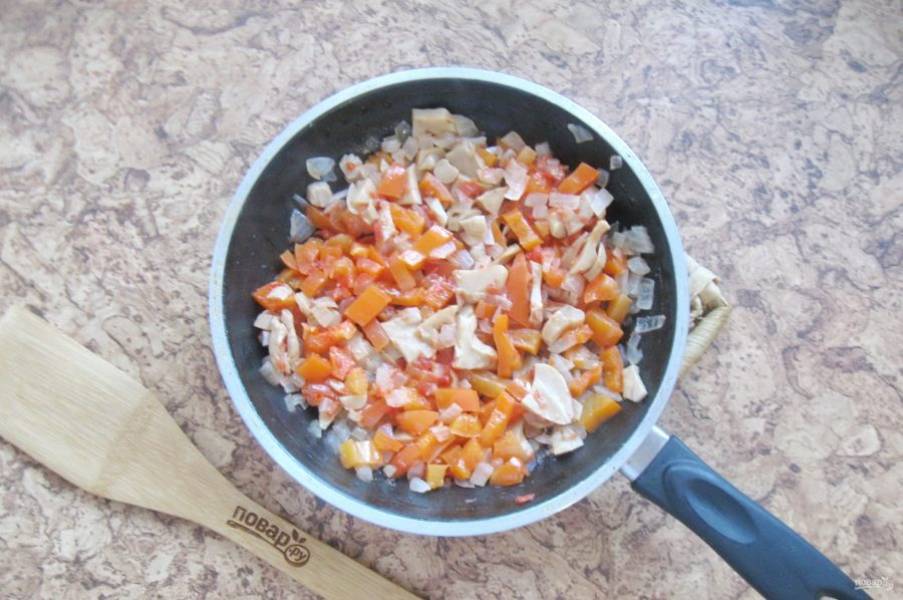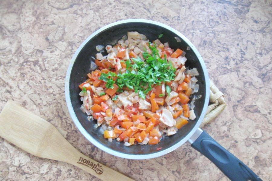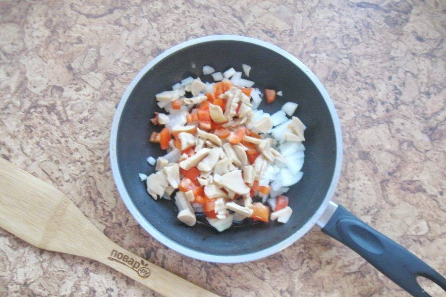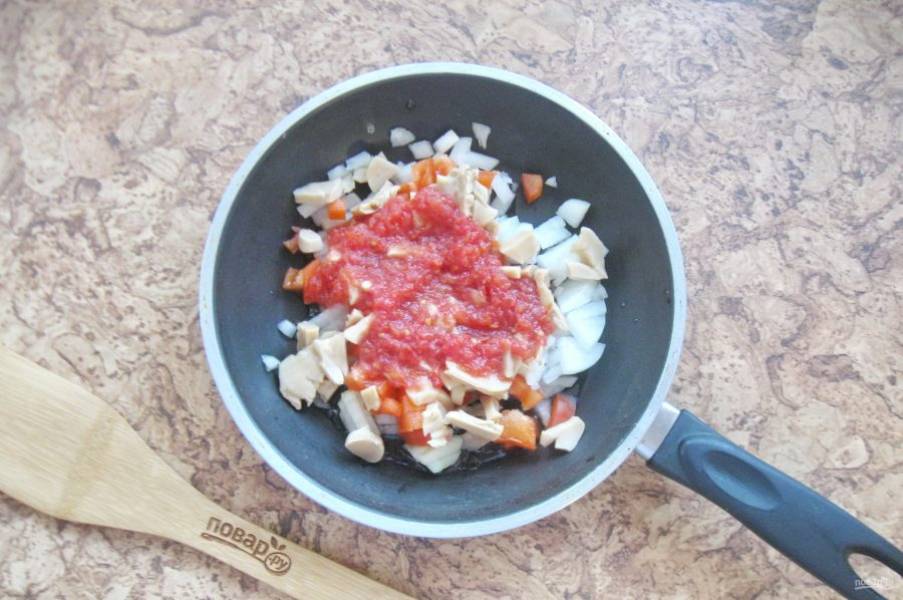 Помидор измельчите любым способом и добавьте к луку, перцу и грибам.