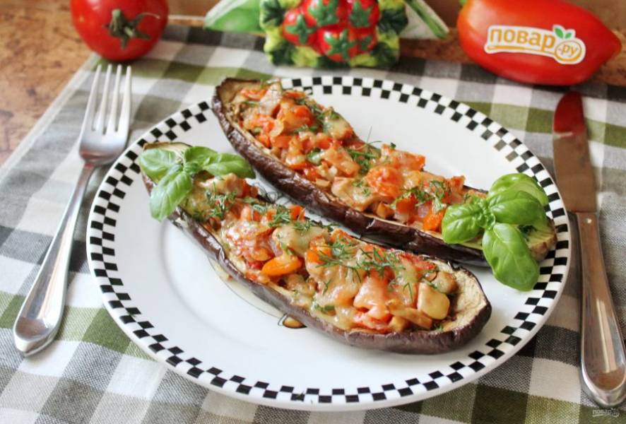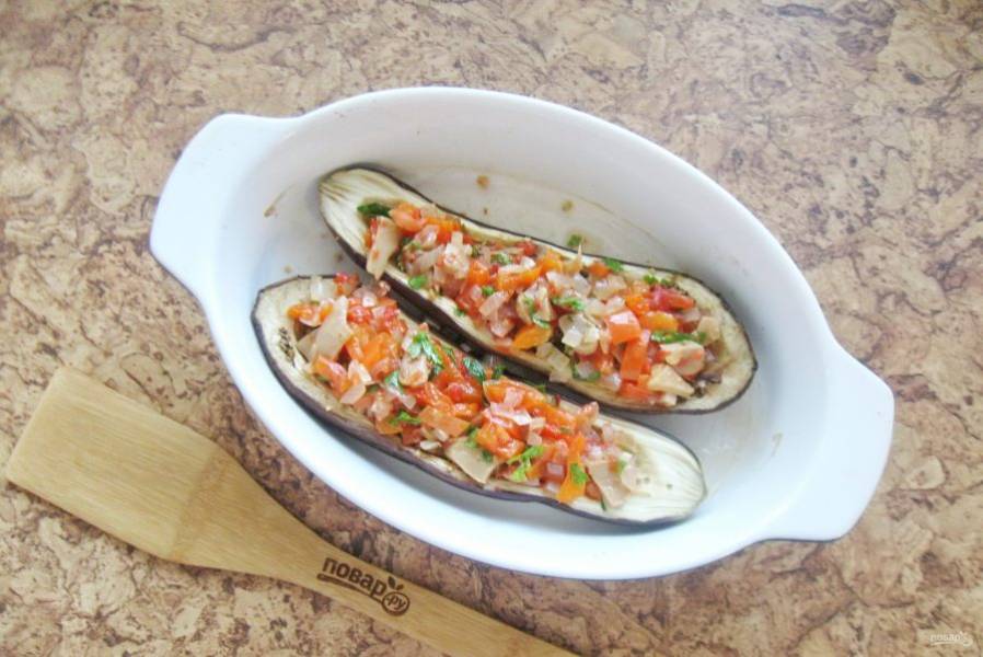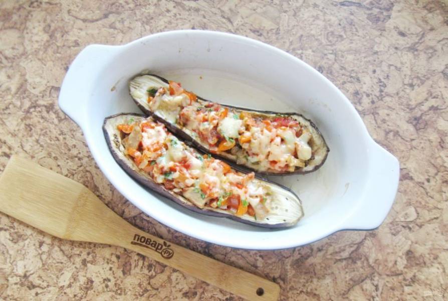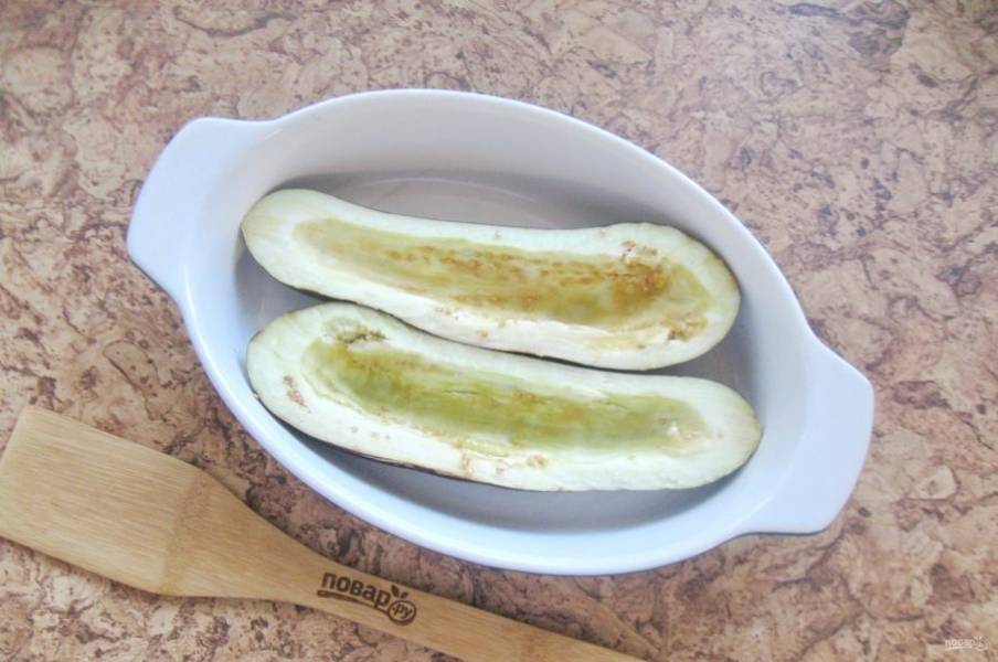 Баклажан помойте и разрежьте вдоль на две части. Чайной ложкой или ножом вырежьте из каждой половинки мякоть. Выложите баклажан в форму для запекания, смазанную маслом и поставьте в духовку, разогретую до 180 градусов на 20-25 минут.
