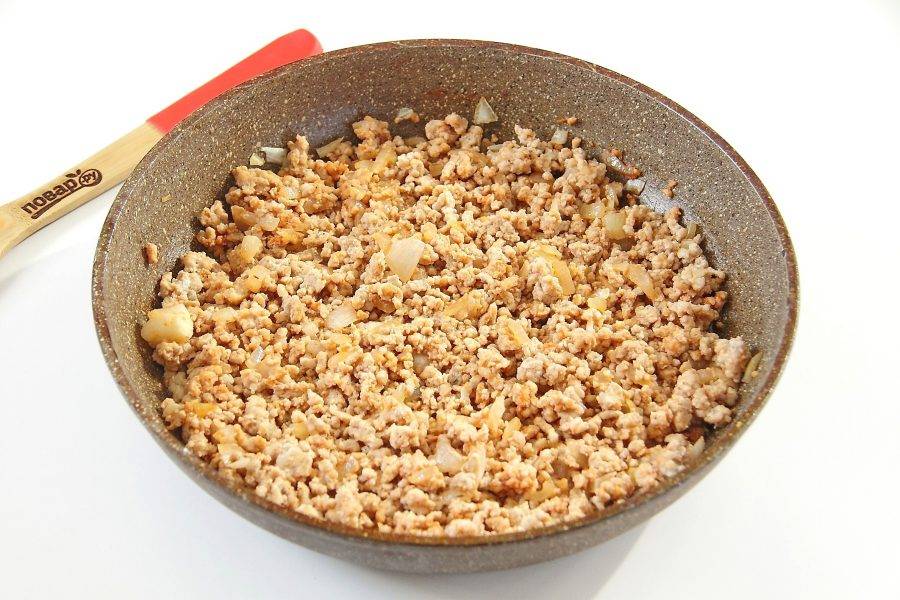 Обжарьте лук до мягкости, добавьте фарш, томатную пасту, соль и специи. Готовьте все вместе, периодически помешивая, около 5-7 минут.