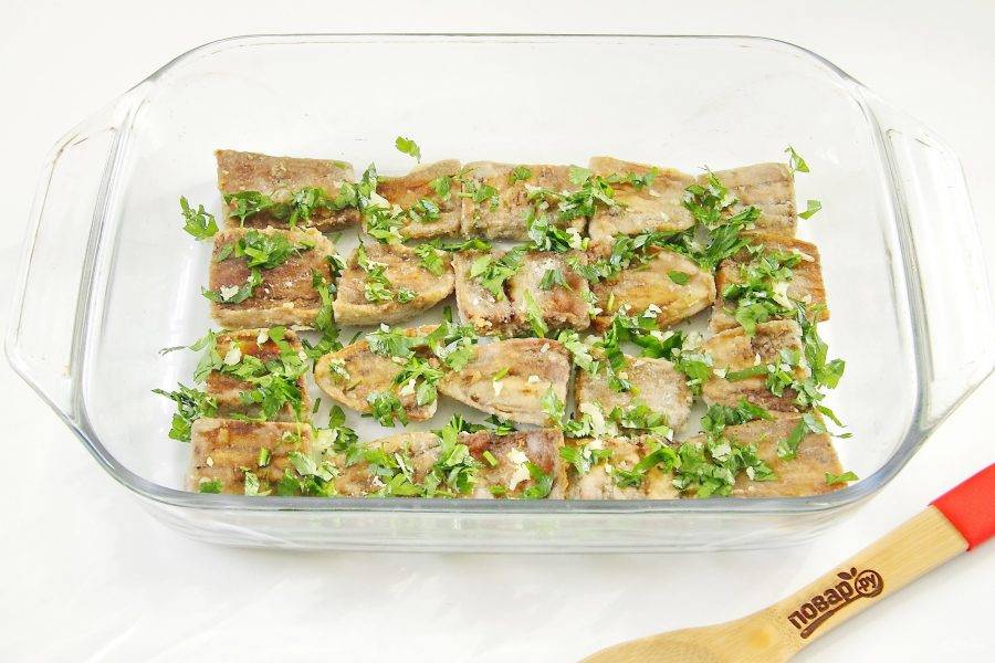 Слой перца и зелени. Повторяем слои в таком же порядке еще раз. Сверху накрываем форму фольгой и запекаем блюдо при 200 градусах 30 минут.