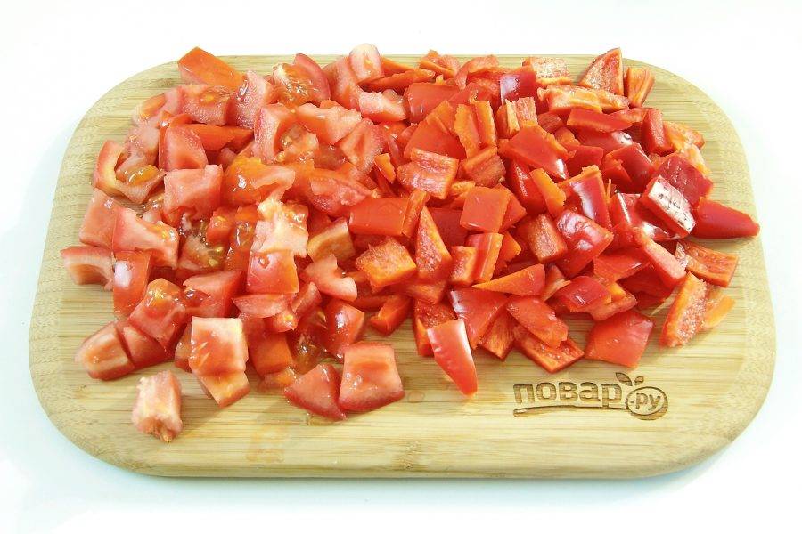 С баклажан снимите шкурку, нарежьте вдоль, а затем квадратиками.