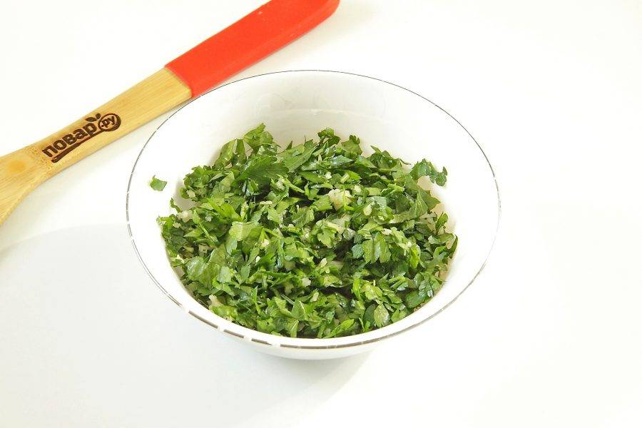 Соедините любую свежую зелень (у меня петрушка) и пропущенный через пресс чеснок. Добавьте немного соли и перемешайте.