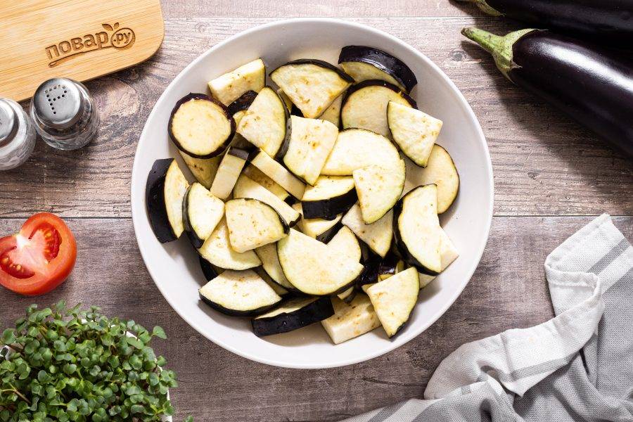 Переложите баклажаны в глубокую миску, подсолите и оставьте на 15-20 минут. Затем промойте в холодной воде и отожмите.