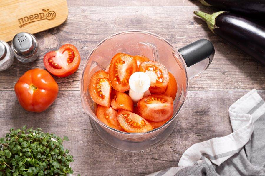 Помидоры помойте, удалите плодоножки и разрежьте на 4 части. Измельчите в блендере до консистенции пюре или прокрутите через мясорубку.