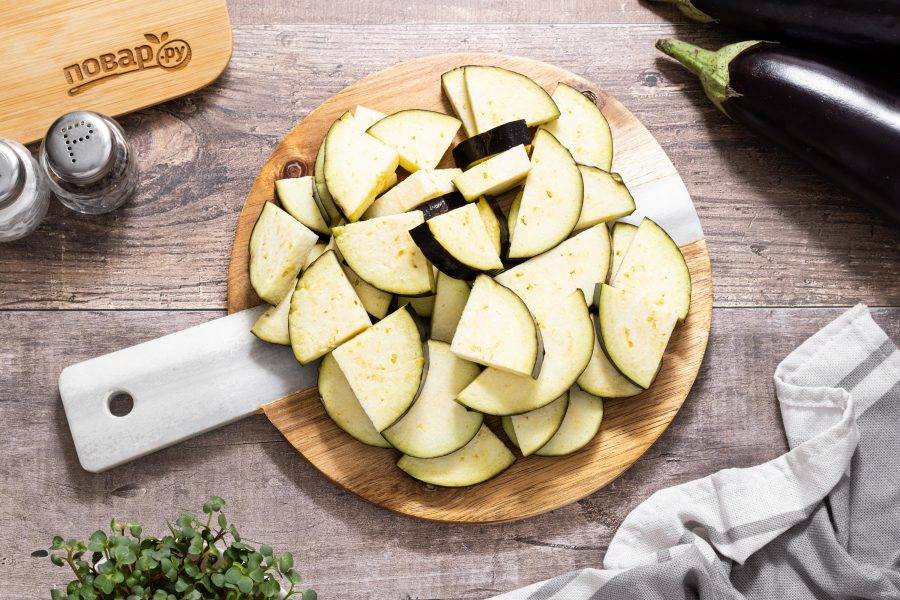 Баклажаны помойте, нарежьте кружочками средней толщины. Если баклажаны крупные, то каждый кружочек можно разрезать на 2-4 части.