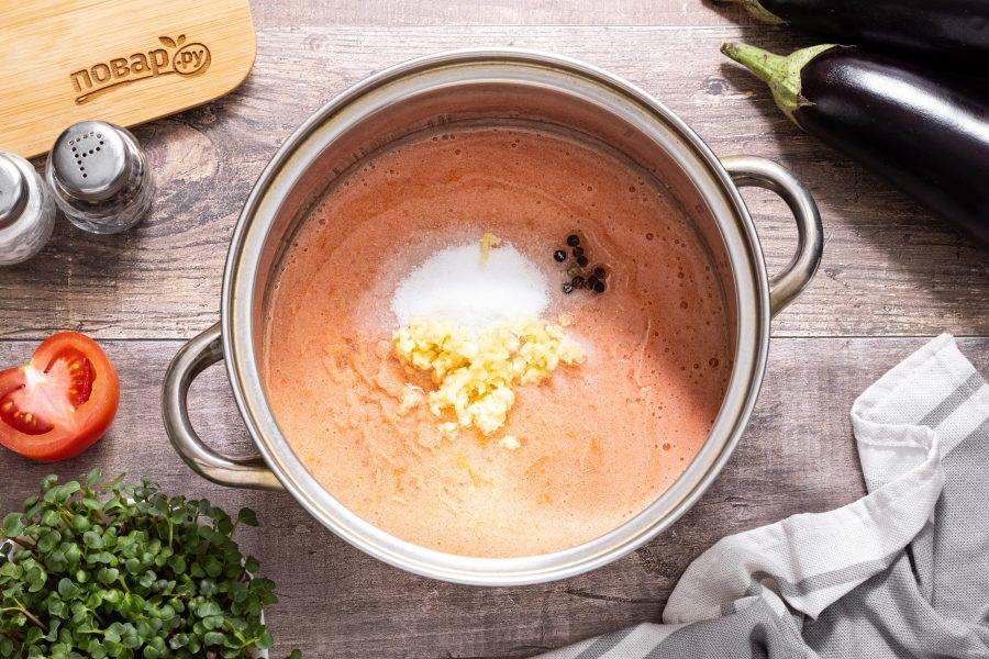 Перелейте томатное пюре в кастрюлю. Доведите до кипения. Добавьте сахар, соль, уксус и пропущенный через пресс чеснок, влейте растительное масло.
