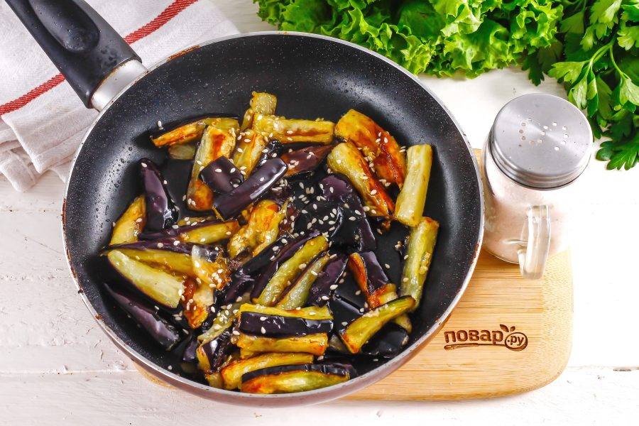 Ароматное и аппетитное блюдо из баклажанов будет готово за пару минут — его с легкостью можно подать как гарнир к мясу или рыбе либо как основное блюдо на обед, ужин. Соус добавляйте в самом конце.