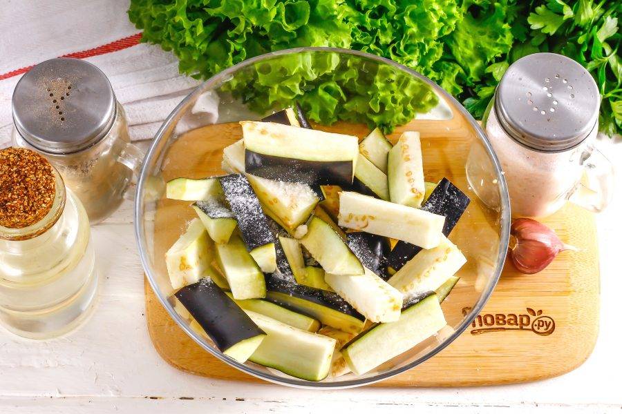 Всыпьте в емкость с баклажанами соль, молотый черный перец и кукурузный крахмал. Тщательно перемешайте.