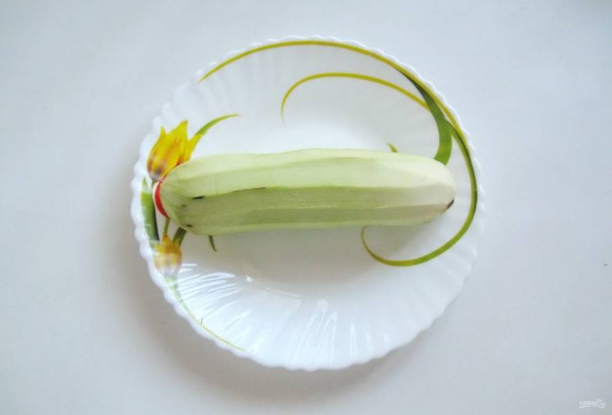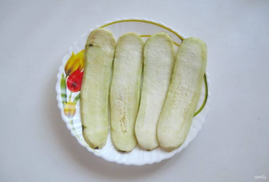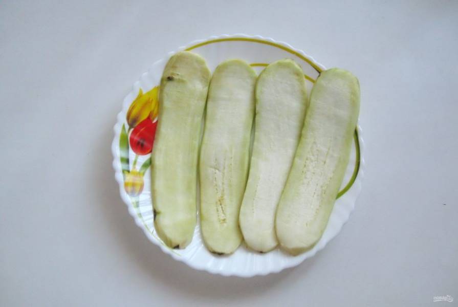 Нарежьте баклажан вдоль пластинами толщиной 5-7 мм.