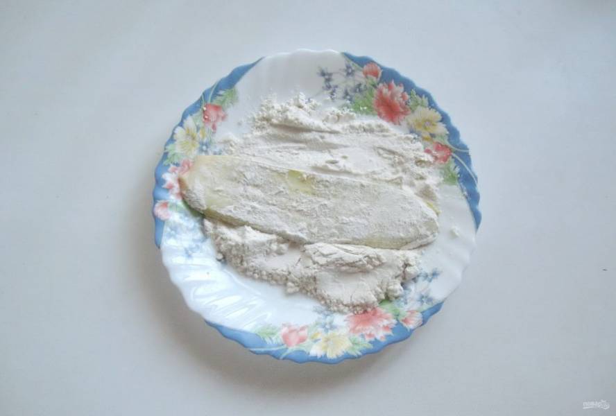 В тарелку насыпьте муку и обваляйте каждую пластину баклажана в муке.
