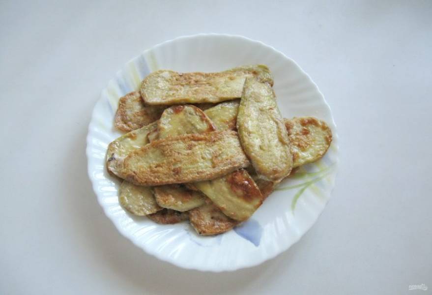 Яйцо слегка взбейте, как на омлет и обмакните пластины баклажана в яйцо с обеих сторон.
