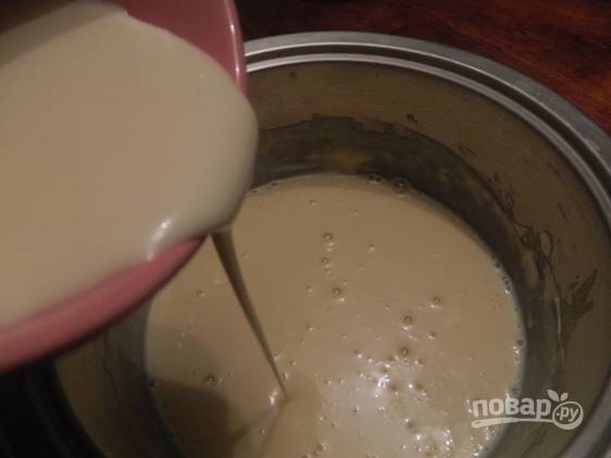 Затем медленно вливаем молочно-мучную смесь в сотейник к сметане и меду и быстро, хорошо перемешиваем венчиком.