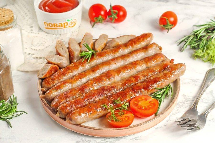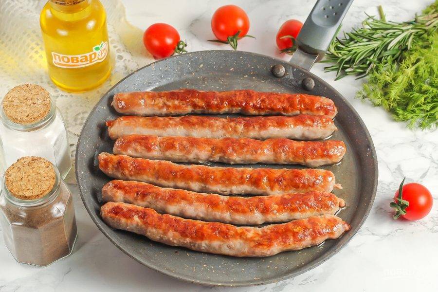Разогрейте сковороду с растительным маслом и поджарьте колбаски по 3-4 минуты с каждой стороны на умеренном нагреве. Можно поджарить их и на гриле, на мангале, запечь в духовке.