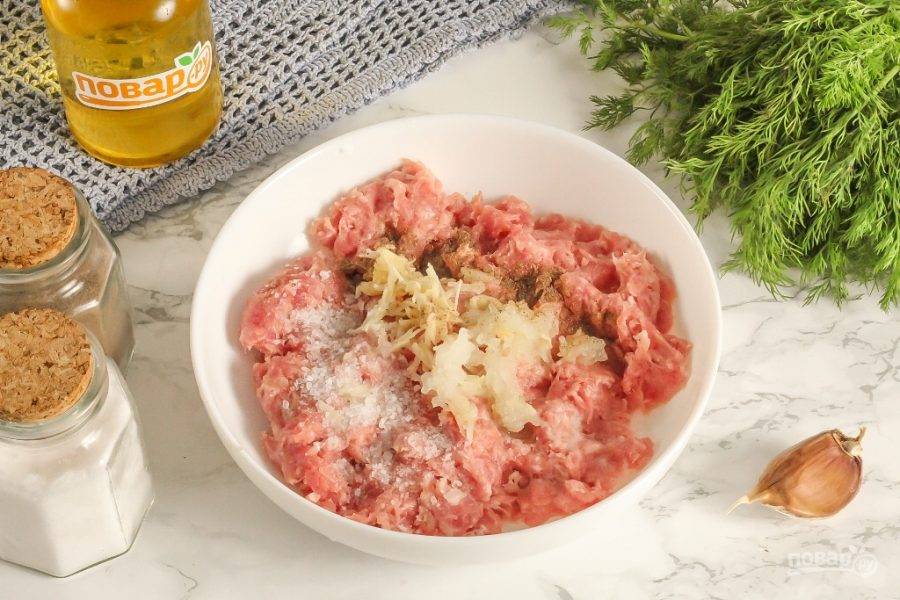 Выложите мясной фарш в салатник или миску. Очистите лук и чеснок от кожуры, промойте в воде. Натрите на терке с мелкими ячейками половину луковицы и зубчики чеснока прямо в емкость. Всыпьте соль и молотый черный перец.