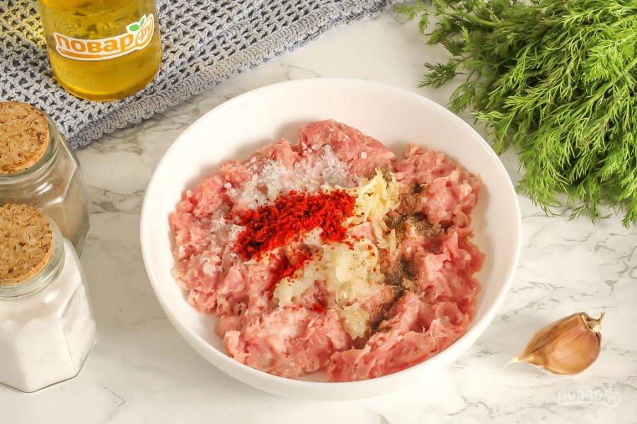 Всыпьте молотую паприку, по желанию добавьте и другие специи, пряности и тщательно вымешайте фарш.