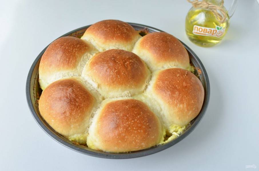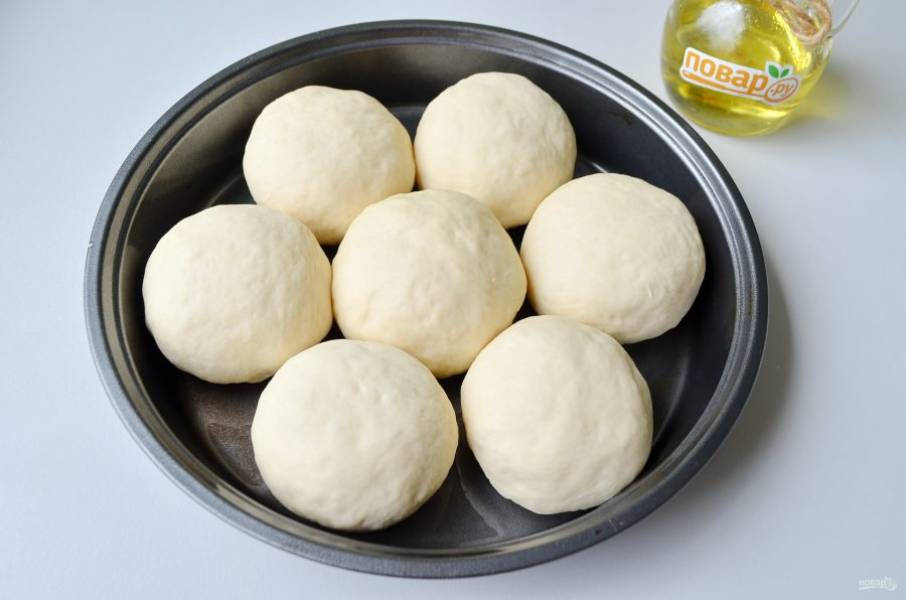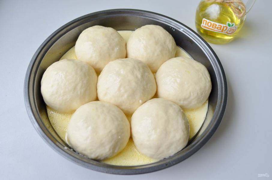 9. Форму смажьте растительным маслом. Уложите булочки швами вниз. Диаметр моей формы — 20 см.