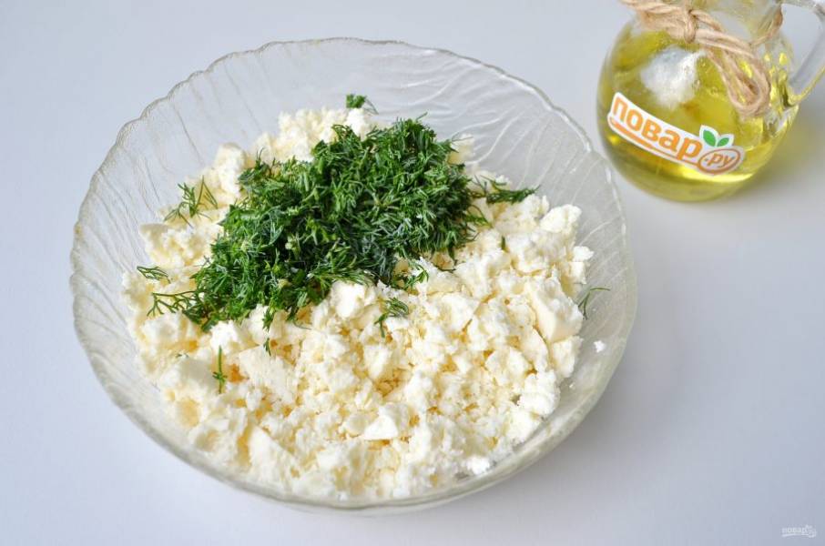 6. Для начинки раскрошите брынзу руками, добавьте мелко порезанный укроп, белок. Перемешайте.