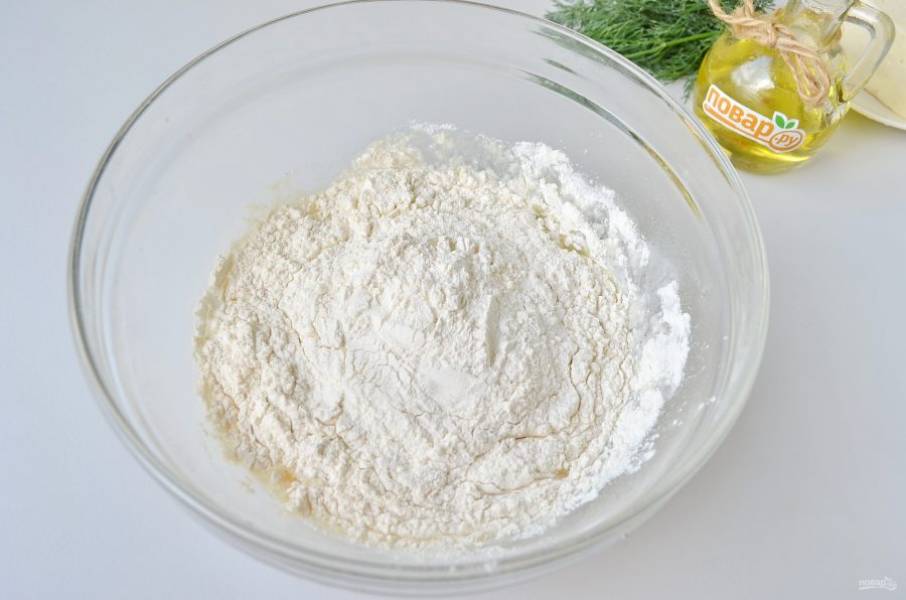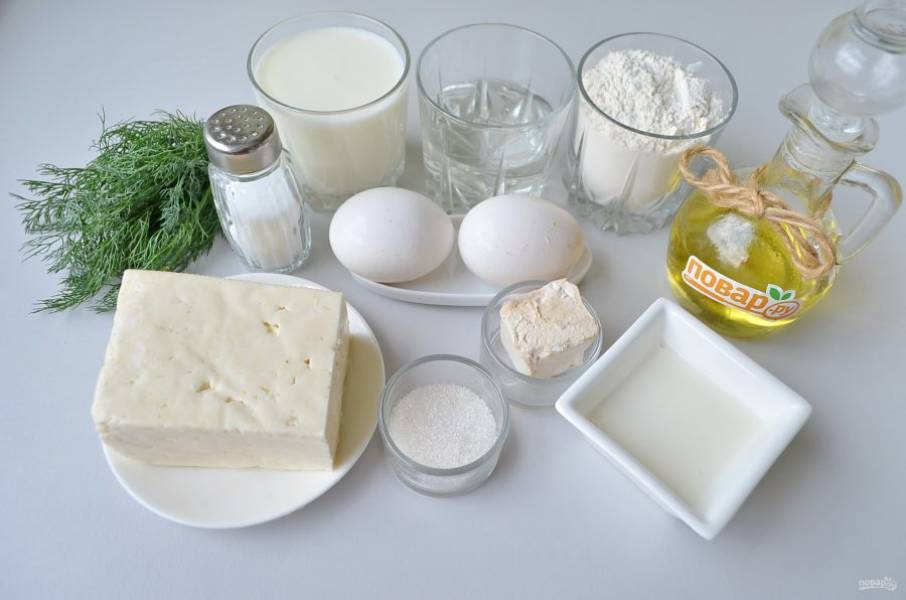 1. Подготовьте продукты для теста, начинки и заливки. В начинку, кроме брынзы, добавляют много зелени, это может быть шпинат, зеленый лук, укроп, петрушка или кинза.