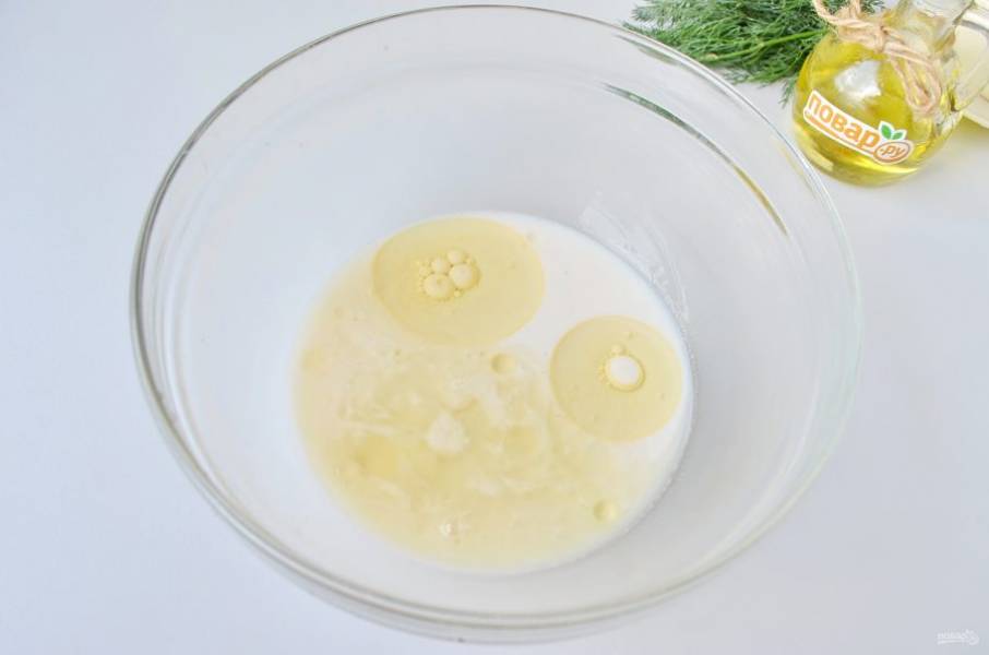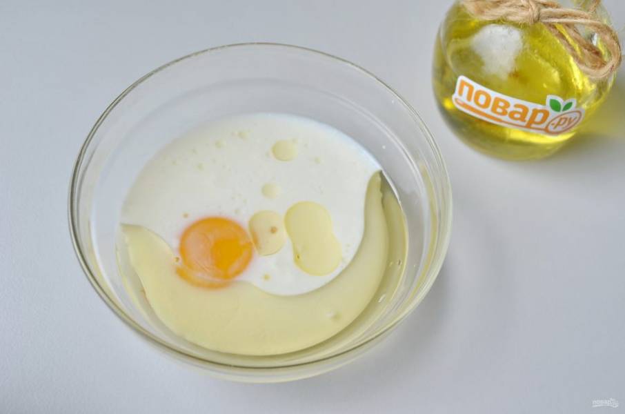 10. Из кефира, молока, желтка и масла приготовьте заливку. Просто взболтайте вилочкой ингредиенты.