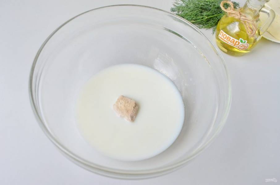 2. Соедините молоко с теплой водой, добавьте соль и сахар, дрожжи. Перемешайте, чтобы дрожжи полностью растворились.