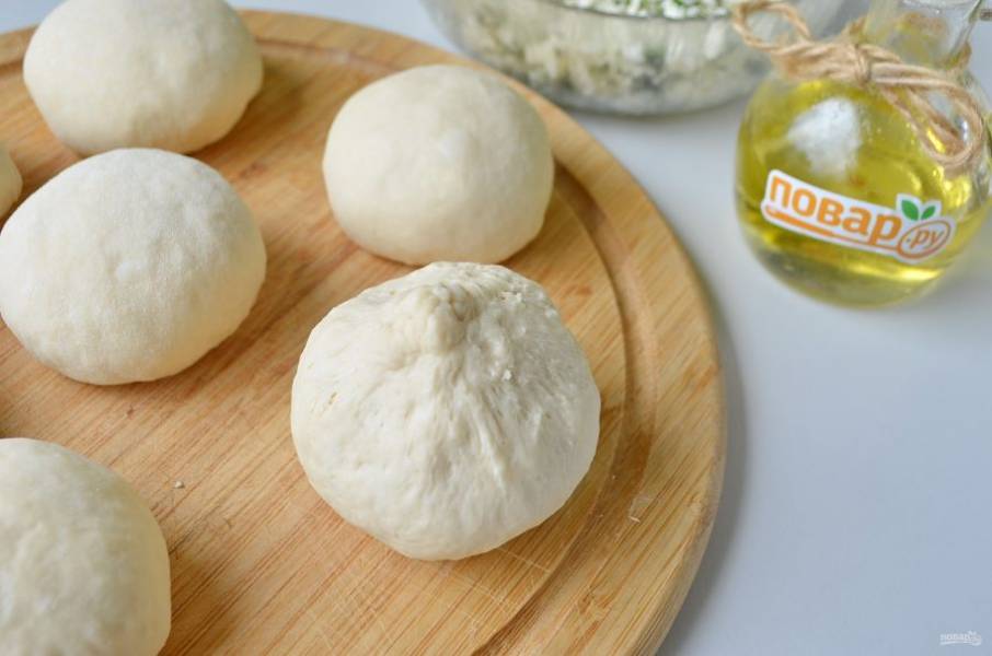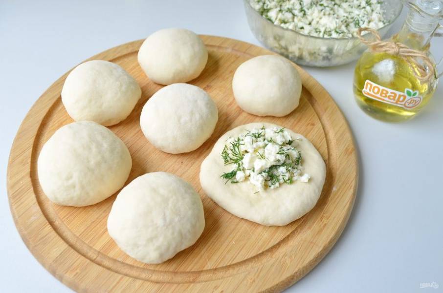 7. Разделите тесто на кусочки одинакового размера. Каждый кусочек растяните пальцами, положите часть начинки. Это удобно делать держа тесто в руке.