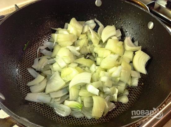 Репчатый лук чистим, нарезаем и отправляем на сковороду. Обжариваем до легкого золотистого цвета.