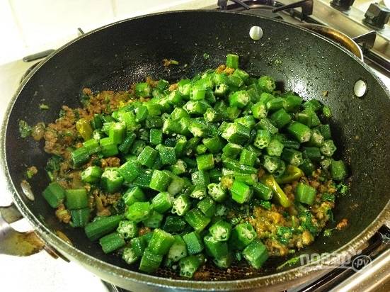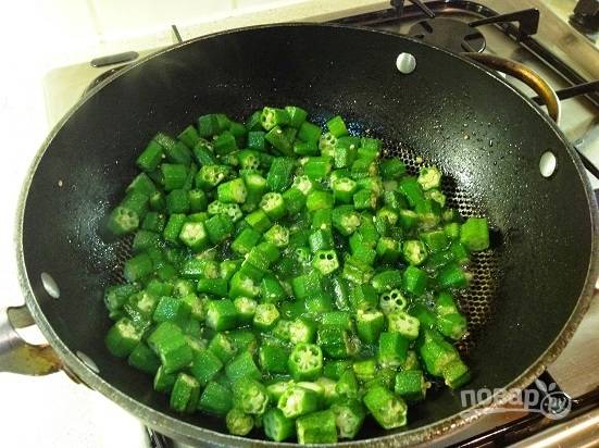 Нагреваем на сковороде растительное масло и обжариваем бамию минут 10, не забываем перемешивать.