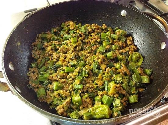 И бамию. Перемешиваем и под крышкой на маленьком огне готовим еще минут 10.