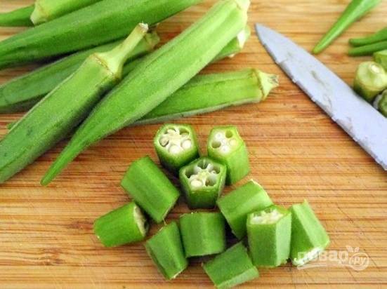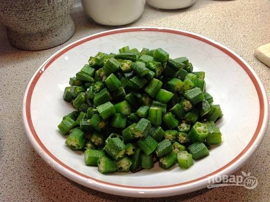 Приведем в порядок бамию. Тщательно помоем, обрежем кончики и, если у вас крупная бамия, нарежем ее на кусочки.