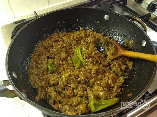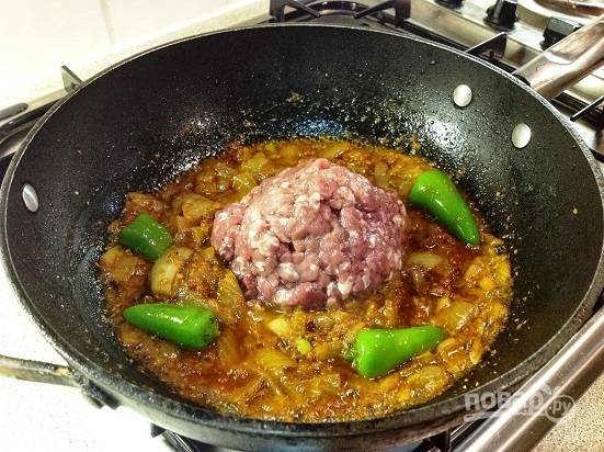 Добавляем перец халапеньо и фарш. Перемешиваем, доводим до кипения, еще раз размешаем и накрываем сковороду крышкой. Готовим на маленьком огне минут 15.