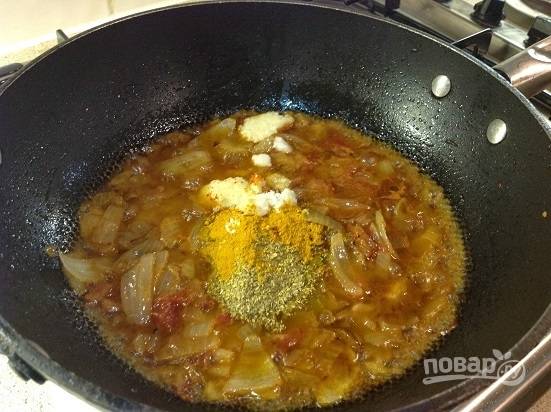 Добавим специи на сковороду к луку. Перемешиваем и обжариваем минуту-полторы.