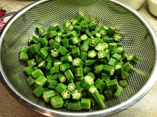 Выбираем обжаренную бамию со сковороды, оставляя растительное масло.