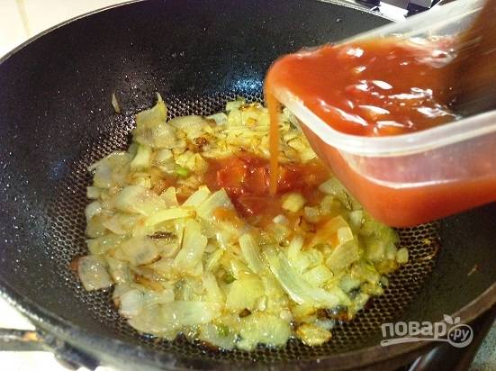 Измельчаем помидоры и добавляем к луку. Доводим до кипения.