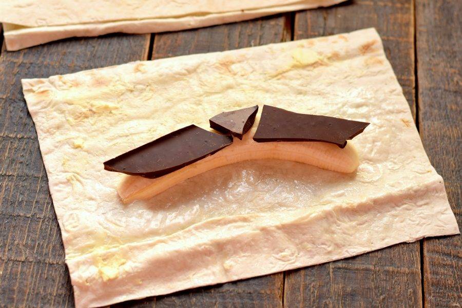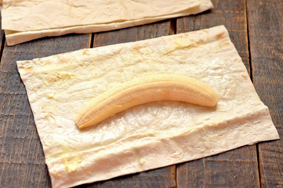 В середину лаваша выложите половинку банана. Если банан имеет очень изогнутую форму, его можно разрезать поперек на две части, так его будет удобнее свернуть в лаваш.