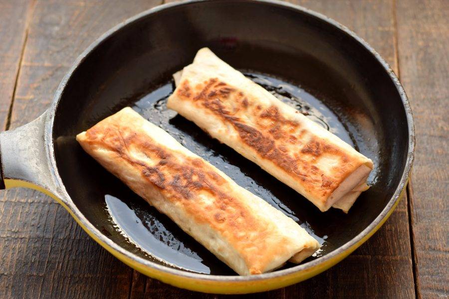 Жарьте рулетики на среднем огне под крышкой, чтобы шоколад внутри полностью растаял. Когда одна сторона рулетов подрумянится, переверните их на другую.