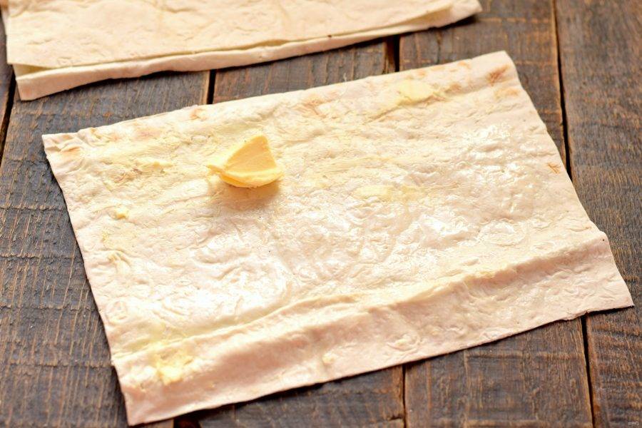 Тонкий лист лаваша нарежьте на одинаковые куски прямоугольной формы. Размер нарезанных листов зависит от величины банана, они должны быть шире и длиннее плодов. Каждое полотно лаваша смажьте мягким сливочным маслом по всему периметру, так лаваш станет мягче, его будет легче свернуть в рулет.