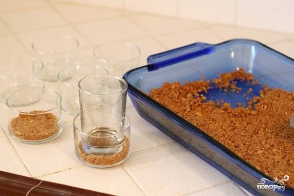 Берём формы для десерта. Выкладываем слои раскрошенного печенья. С помощью ложки прессуем (утрамбовываем).
