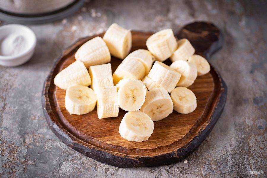 Бананы ополосните в проточной воде и почистите от кожуры. Нарежьте мякоть бананов на небольшие кусочки, для удобства.