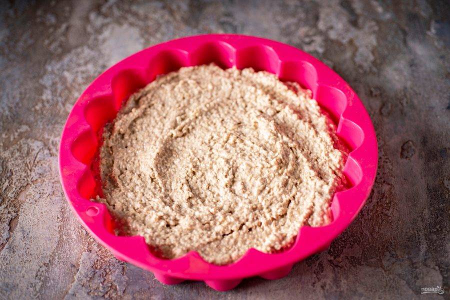 Затем переложите, разравнивая ложкой, готовое тесто в удобную форму для выпекания — у меня силиконовая форма диаметром 20 см. Пирог отправьте выпекаться в уже разогретую до 180 градусов духовку на 35-40 минут.