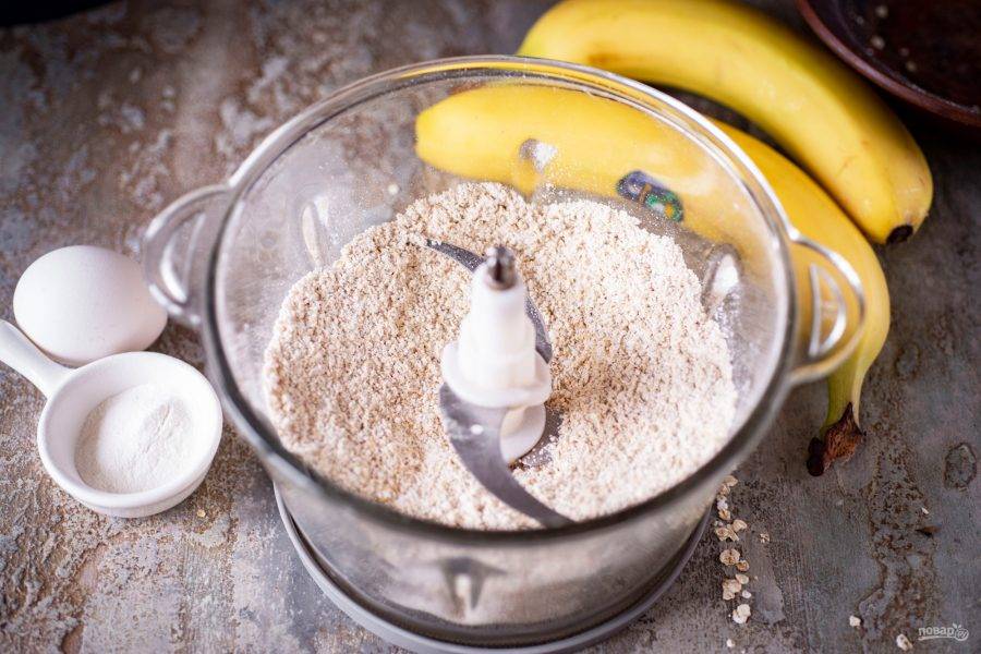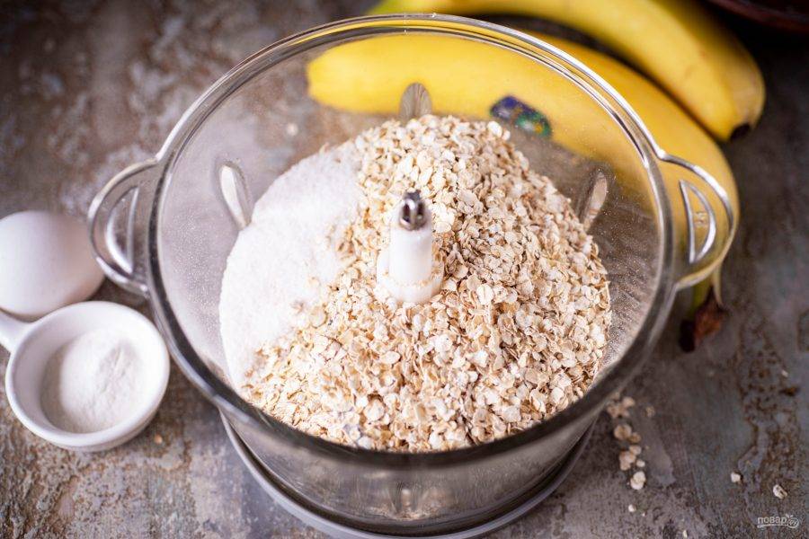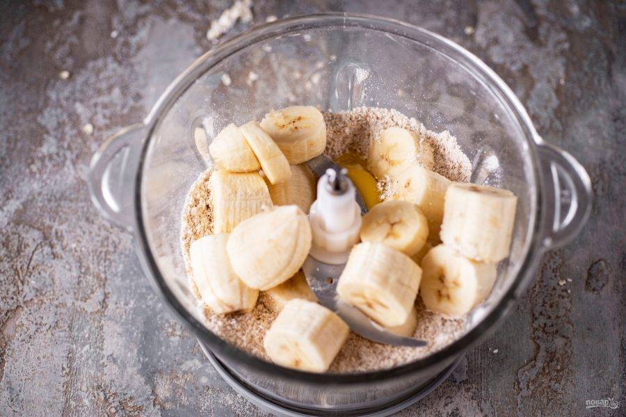 Кусочки бананов выложите в чашу блендера к измельченным хлопьям с сахаром и туда же вбейте яйца.