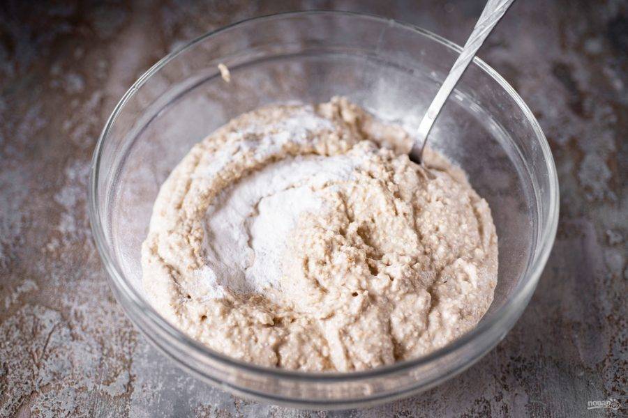 В итоге должно получиться вязкое, однородное, овсяное тесто, которое переложите в просторную миску и добавьте разрыхлитель. Перемешайте.