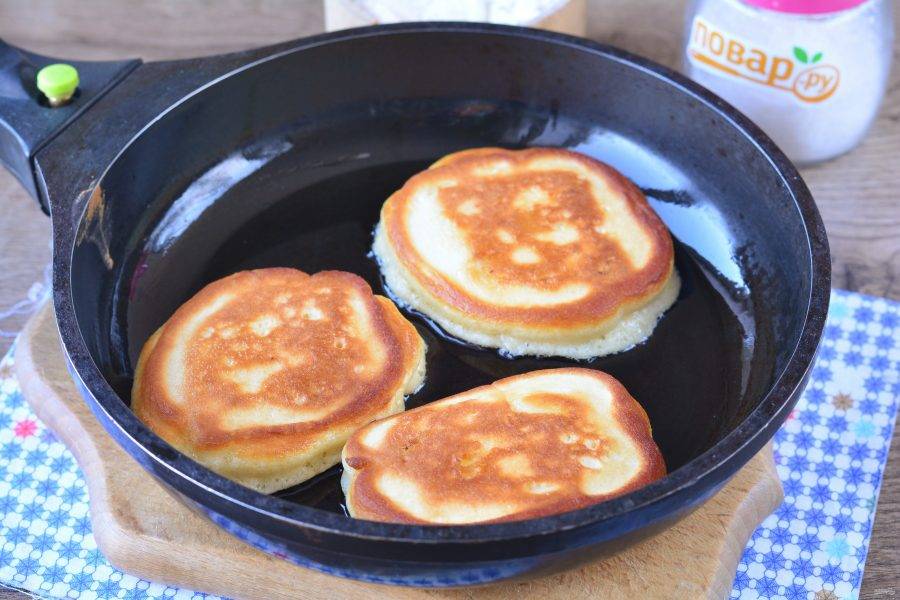 Через 2-3 минуты переверните и жарьте с обратной стороны до румяной корочки. За счет разрыхлителя оладьи будут пышными.