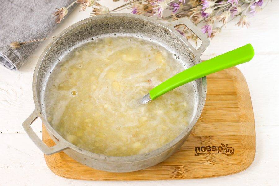 Влейте горячую воду и поместите емкость на плиту, тщательно перемешав. Доведите до кипения и отварите примерно 3-5 минут.
