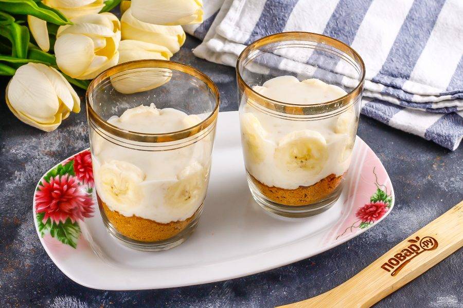 Второй банан очистите от кожуры, нарежьте ломтиками, разделите на две порции и одну из них выложите в крем, примыкая к стенкам стаканов или чашек, если они прозрачные.