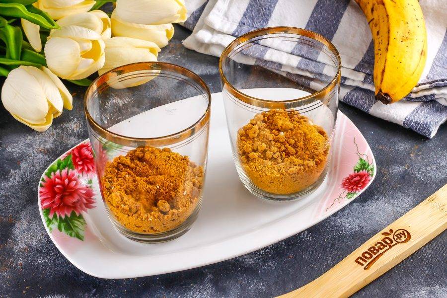 Разделите песочную крошку на две части и одну из них еще разделите на два. Всыпьте в стаканы, чашки или пиалы. Крошку можно приготовить из любого песочного печенья, остатков коржей и т.д.