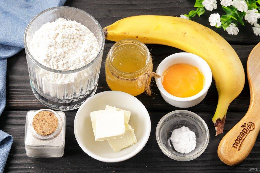 Подготовьте все ингредиенты по списку. Сливочное масло достаньте заранее и дайте ему полежать при комнатной температуре. Банан должен быть спелый.