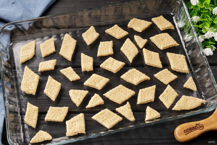 Раскатайте тесто в тонкий пласт (толщиной около 5 мм). Если хотите, чтобы крекеры были хрустящие, раскатайте ещё тоньше.