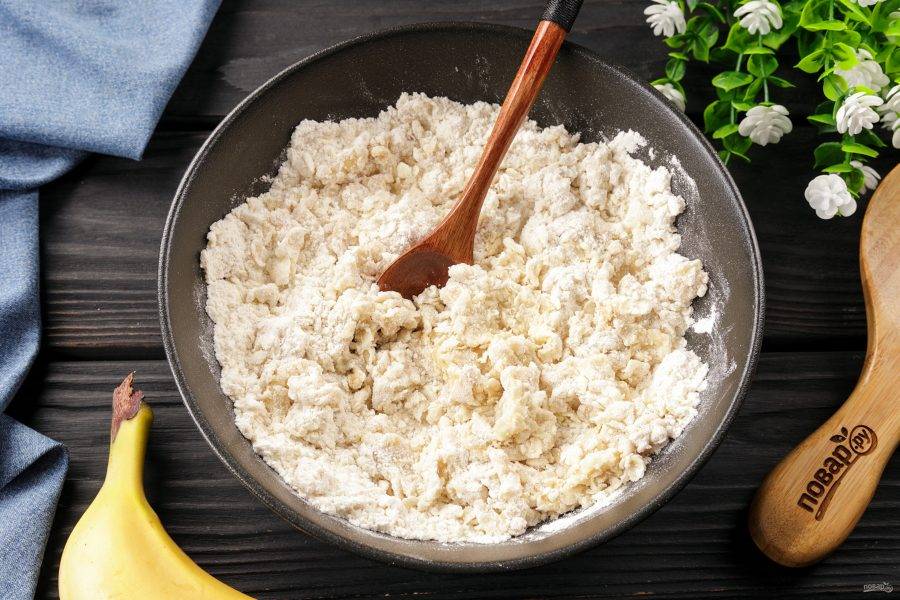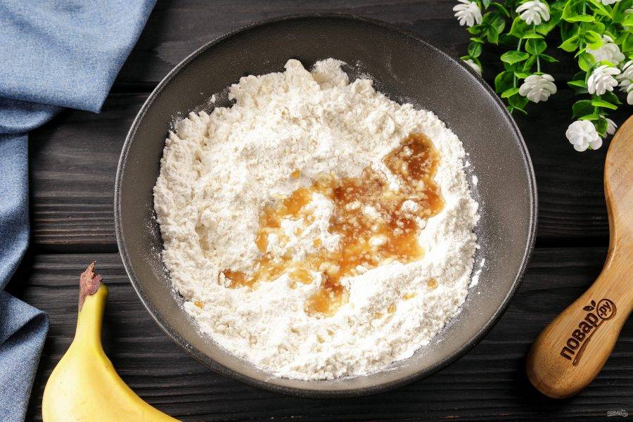 Добавьте размятый вилкой банан. Чем спелее будет банан, тем ароматнее получится выпечка.