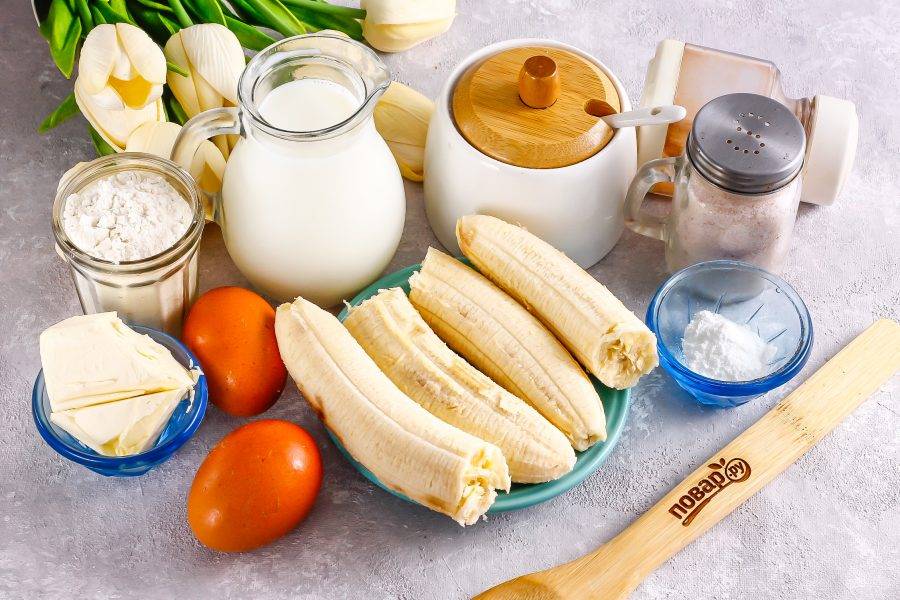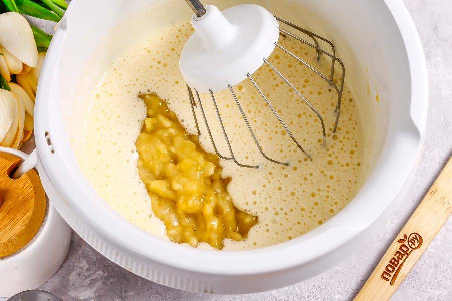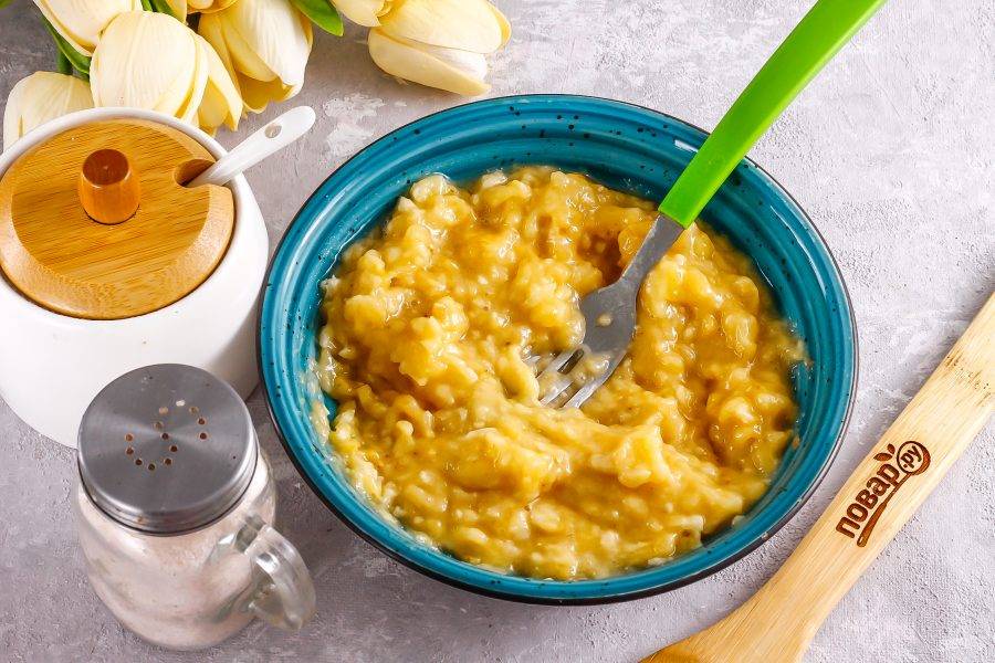 Бананы очистите от кожуры и разломите в глубокую емкость. Отпюрируйте вилкой. Лучше всего использовать слегка переспевшие фрукты — они более сладкие.